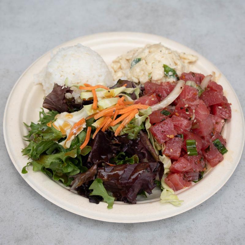 Diced raw ahi seasoned with sesame oil, shoyu, and salt, rice, green salad, and mac salad traditional Hawaiian style.