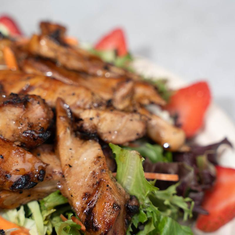 Chopped mixed greens, shredded cabbage, carrots, honey sesame dressing, teriyaki chicken, and strawberries.